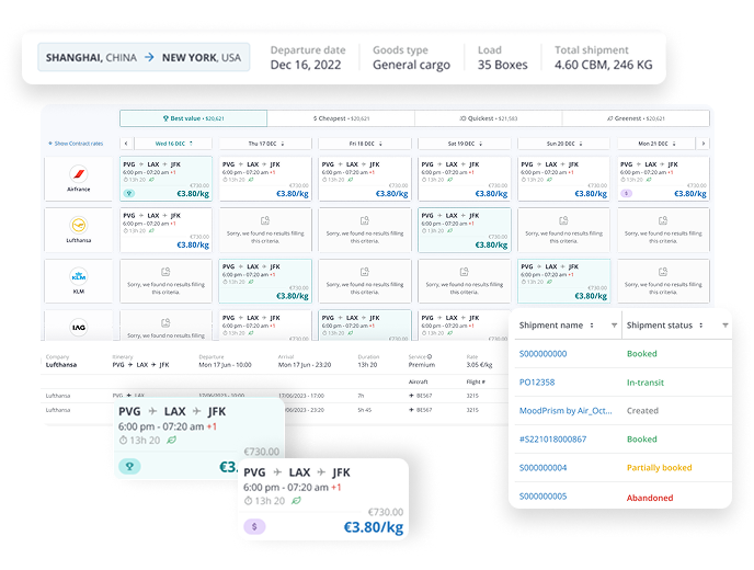 Compare real-time spot and contract rates across all modes of transport, including carrier and sailing/flight-specific visibility via your preferred logistics service providers.